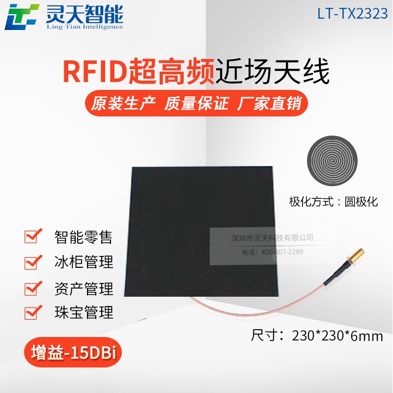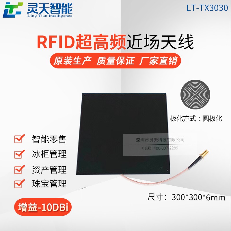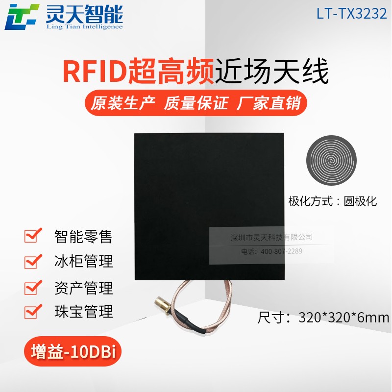 LT-TX3232近场天线具备面积宽、厚度薄、重量轻、场型好的特点,便于安装在标准展柜,其-10dBi的增益,又收束了RF场型、使得多标签近距离的串读问题得以解决,搭配超高频RFID读写设备,效果极佳,线非常薄,适合嵌入式桌面应用,可方便应用于珠宝、零售POS、图书馆、医药保健等超高频频段的RFID场合中。